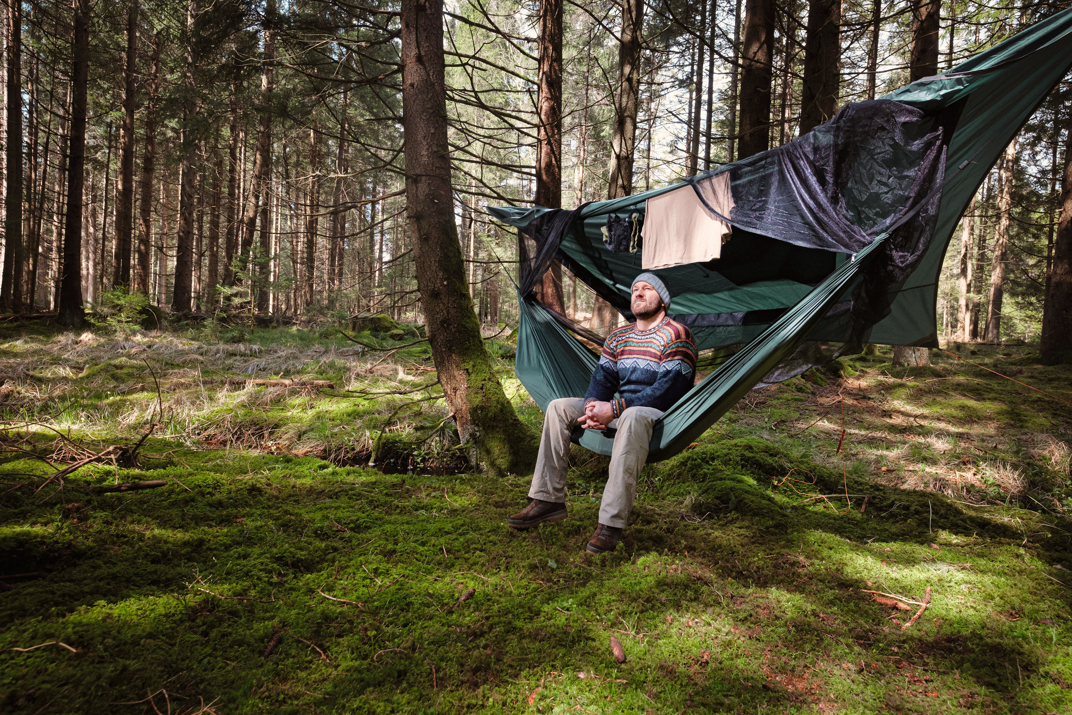 Le point le plus bas du hamac ne devrait pas être plus haut que la hauteur des genoux. Tu t'assures ainsi de ne pas toucher le sol en cas de charge maximale. Il est également important que le hamac s'affaisse légèrement (avec un angle de 25° à 35°).