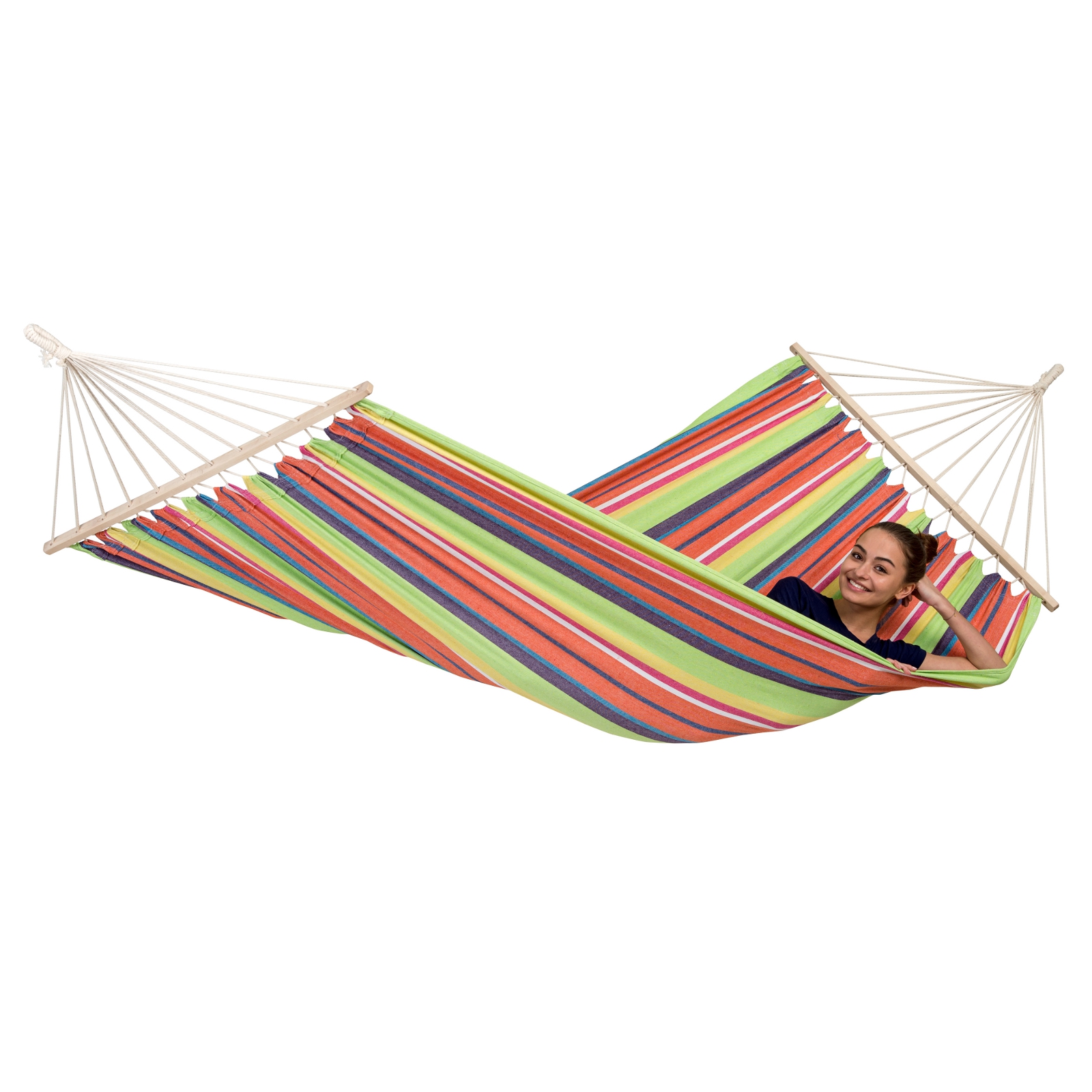 Le hamac à baguettes ultra-stable en matériau EllTex (douillet comme le coton), résistant aux intempéries et aux rayons U.V., ce qui favorise une longue durée d'utilisation.