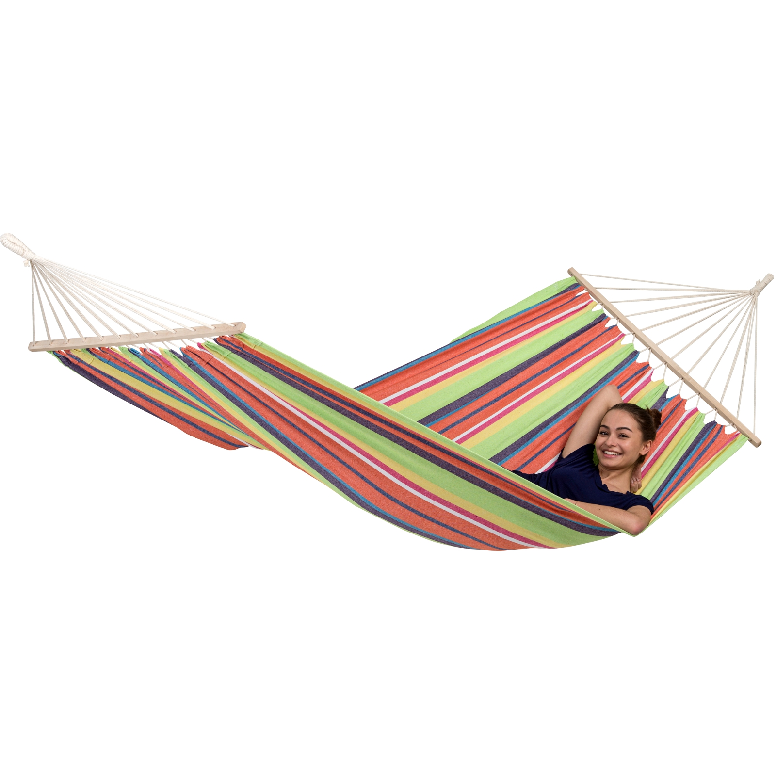 Le hamac à baguettes ultra-stable en matériau EllTex (douillet comme le coton), résistant aux intempéries et aux rayons U.V., ce qui favorise une longue durée d'utilisation.