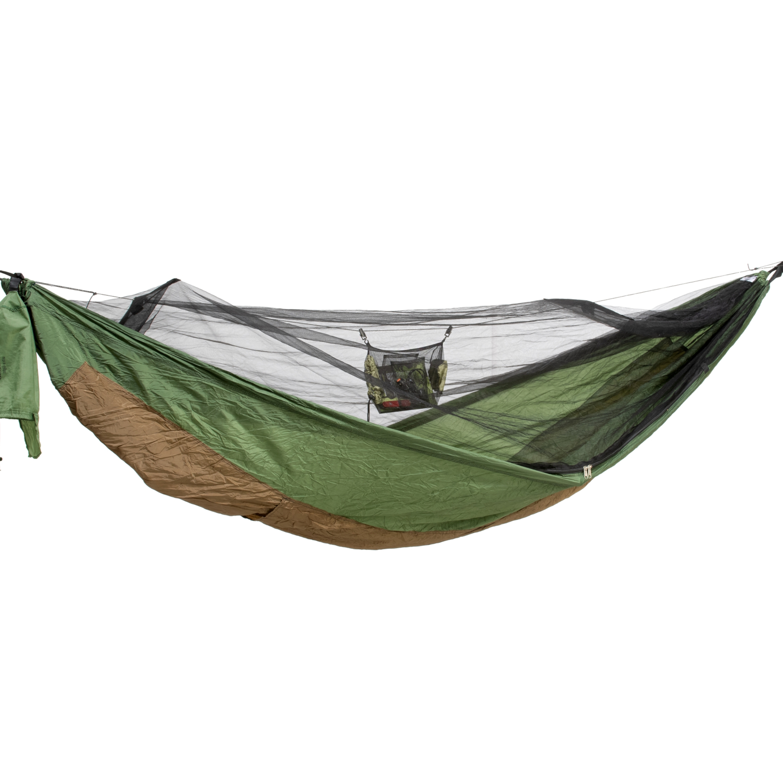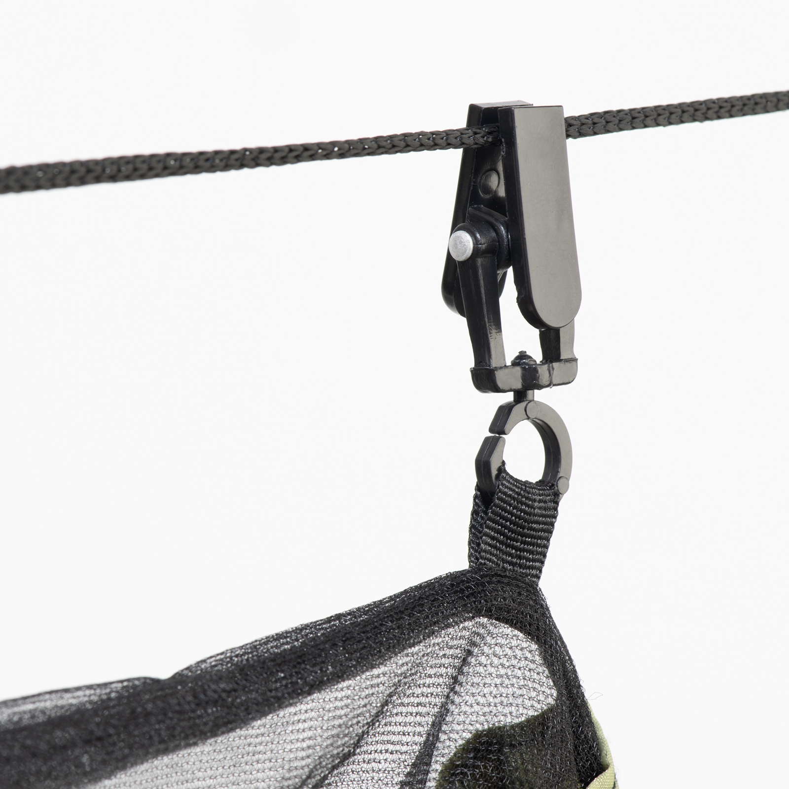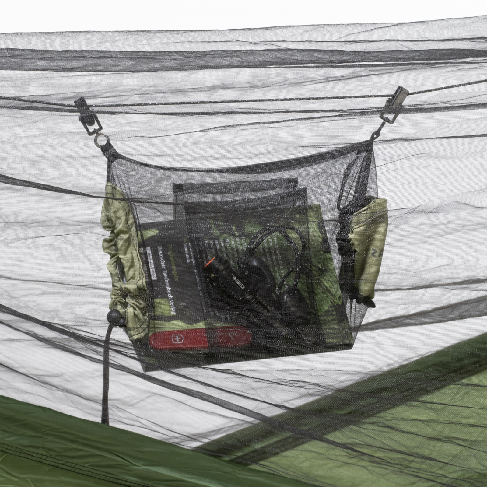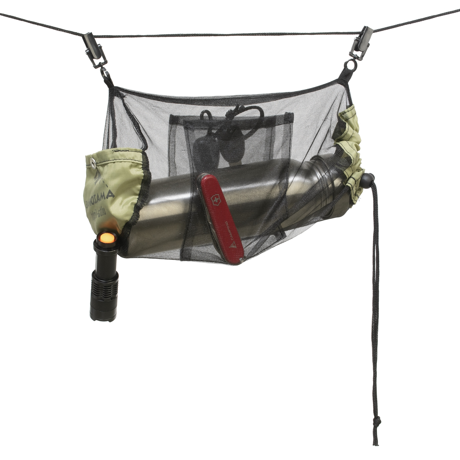 Sac spécialement conçu pour l'intérieur des hamacs ultralégers, permettant de ranger de petits équipements tels que téléphone portable, porte-monnaie, lampe de poche, etc. Grâce à deux clips, l'organiseur peut être fixé de manière fixe ou coulissante sur la ligne d'accrochage du hamac. Le cordon de serrage du hamac doit se trouver à l'intérieur de la moustiquaire. L'organiseur se compose d'un compartiment principal pour les grands objets (livre/tablette, etc.) et de deux petites poches à l'extérieur pour le téléphone portable, le porte-monnaie ou une lampe de poche placée verticalement. Le grand compartiment se ferme à l'aide d'un cordon et d'un bouton de réglage. Sur la face inférieure de l'organiseur se trouve une petite boucle pour attacher une lampe de poche ou autre. Le sac de rangement cousu peut être fermé par un bouton-pression et peut être utilisé comme compartiment de rangement supplémentaire lorsqu'il est suspendu.